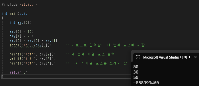 그러므로 배열도 원하는 값을 가지려면 선언과 동시에 초기화해야 함.