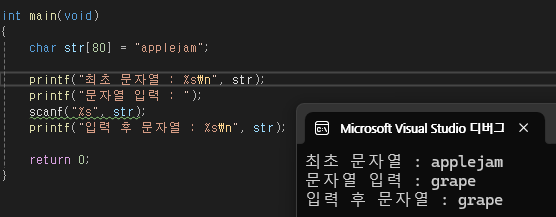 scanf 함수는 char형 배열에 문자열을 입력할 수 있으나 중간에 빈칸이 있는 경우 빈칸 전까지만 입력.